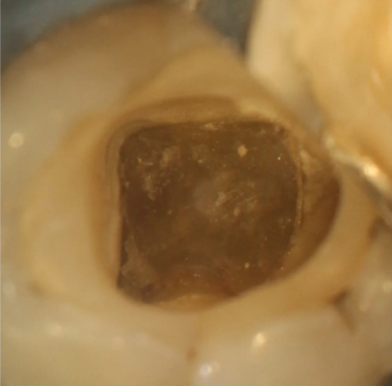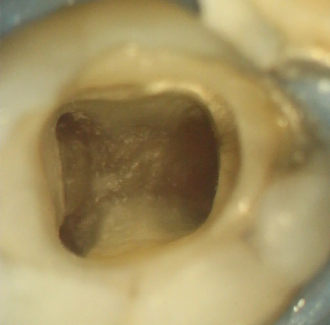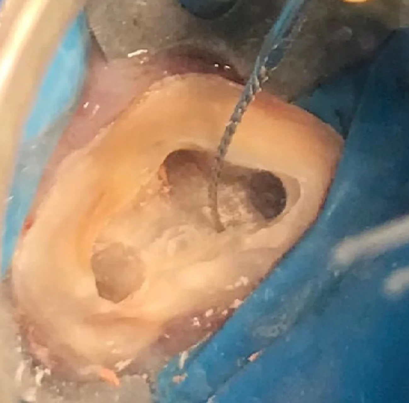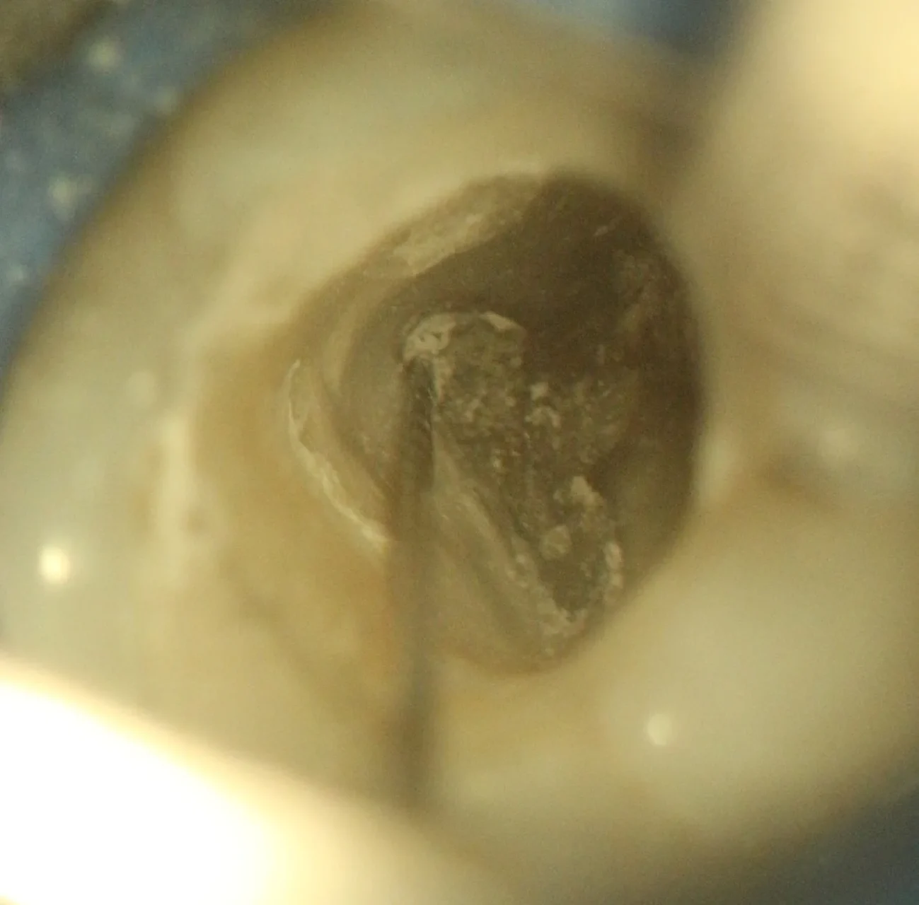 Com melhor visualização, conseguimos remover completamente a polpa infectada e desinfectar todos os canais, reduzindo drasticamente a chance de reinfecção.