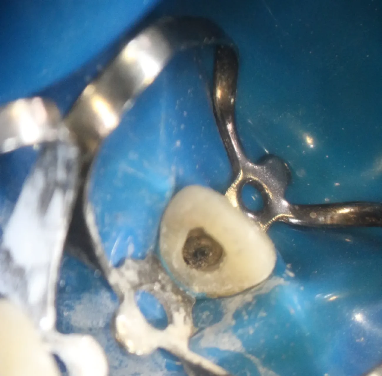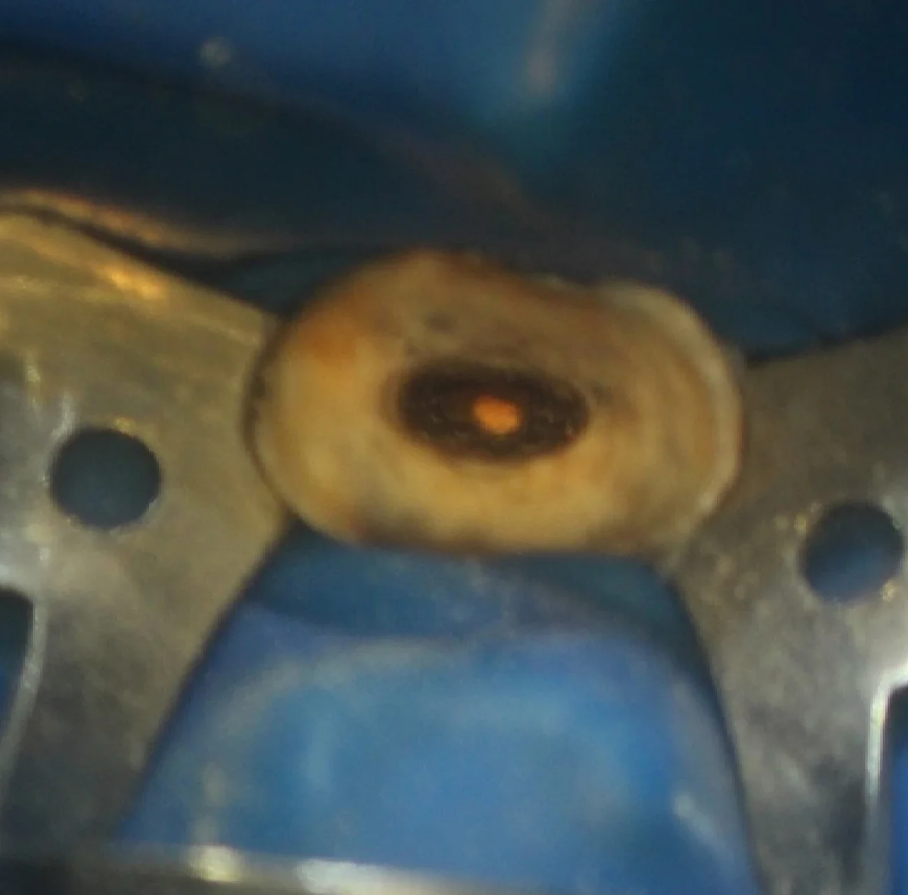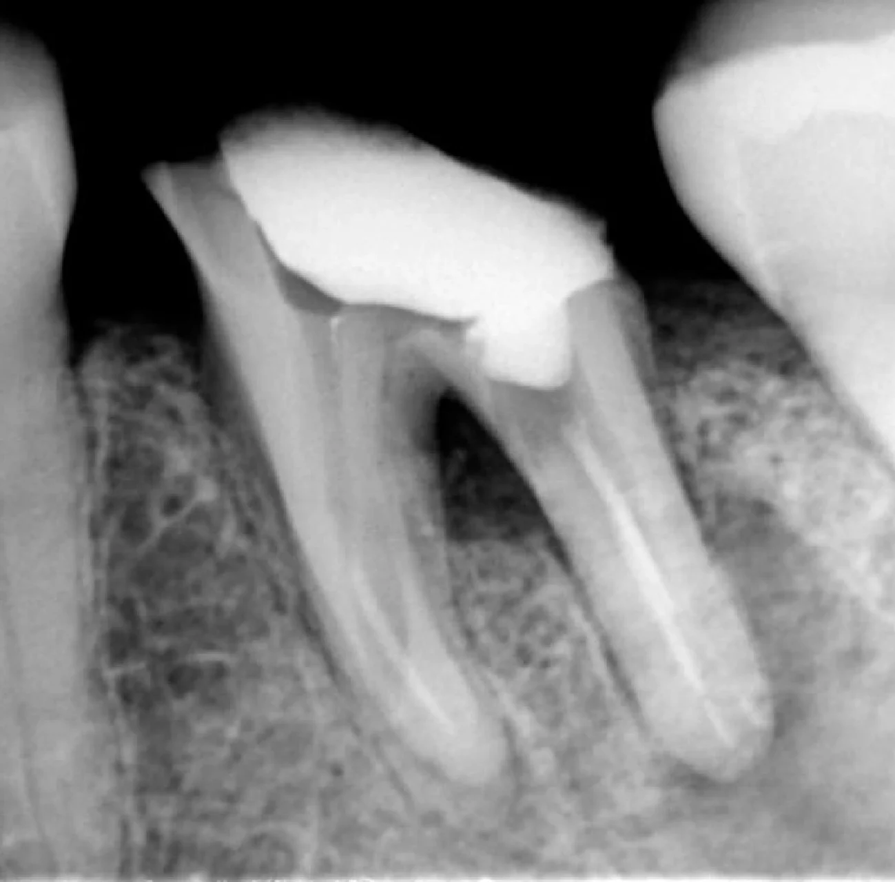 Com melhor visualização, conseguimos remover completamente a polpa infectada e desinfectar todos os canais, reduzindo drasticamente a chance de reinfecção.